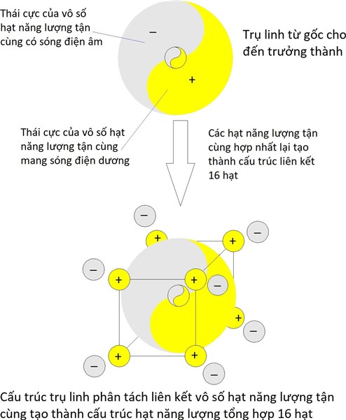 Hình: Phôi năng lượng gốc (Trụ linh) của Tuệ linh được hình thành từ hai hạt năng lượng tận cùng có sóng điện âm – dương